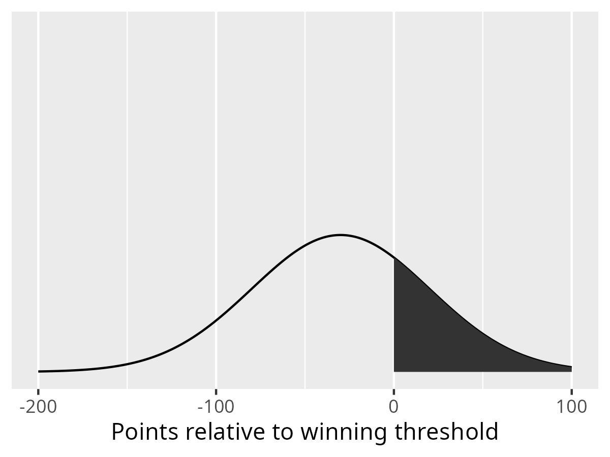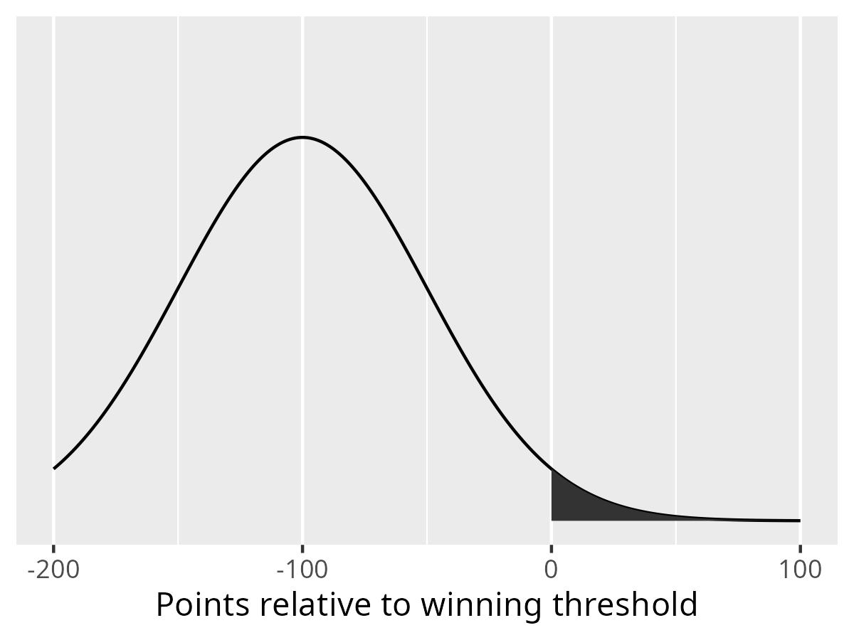 This massively changes the entire game. It makes it so that the “zero” point, the point below which you are completely ambivalent about your score, is potentially very high—for most players, above their median expected score. In the 2025 ACX prediction contest, as of the time of this writing, only 149 people out of three thousand have scored highly enough that they are winning anything at all. This means that unless you are confident that you will place comfortably at the top of the leaderboard, much more important than your expected score is your chance of winning anything at all—your expected score is almost irrelevant, and can be arbitrarily low in a winnings-maximising strategy.